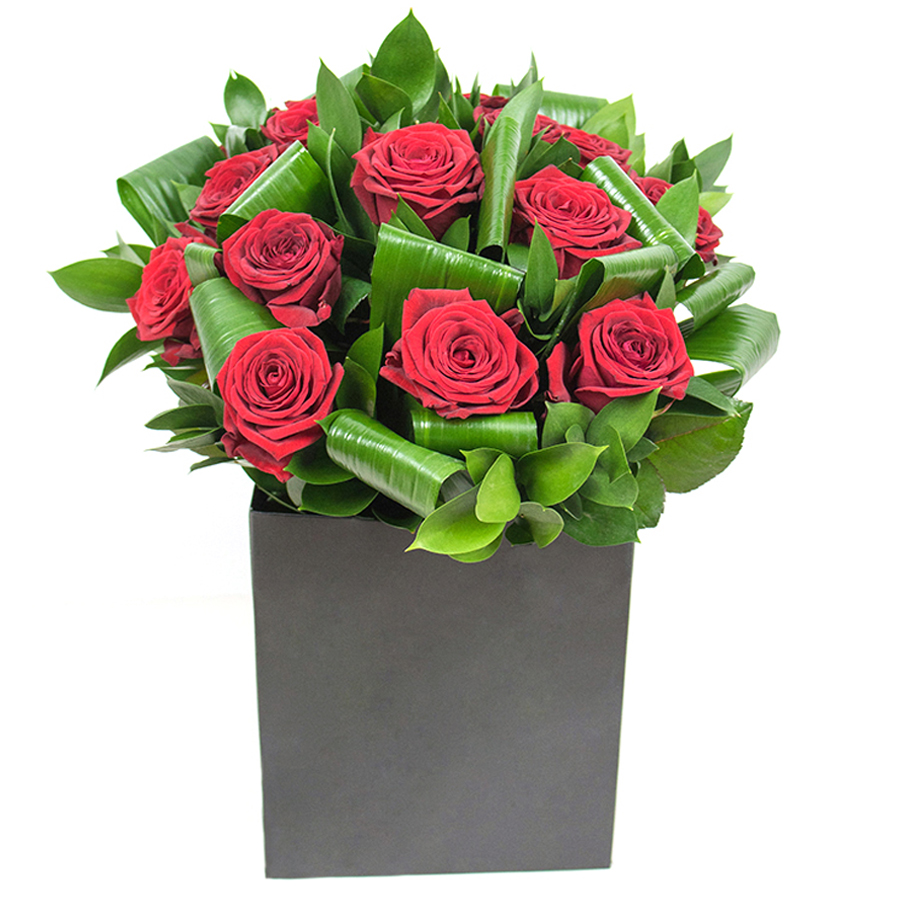 Embrace elegance with our red rose bouquet, featuring vibrant red roses, lush aspidistra leaves, and rich ruscus, designed to create a stunning and sophisticated floral display.